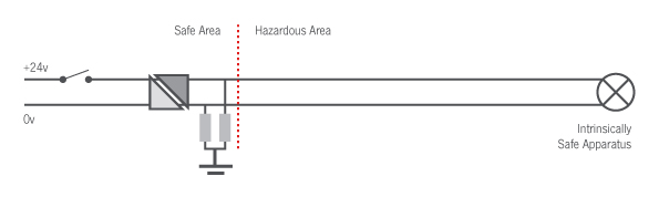 The associated apparatus (intrinsic safety interface) preserves the integrity of the field device such as E2S sounder or beacon. It can only do this if it limits the energy by way of voltage and current to a level below the maximum permitted by field device.